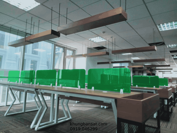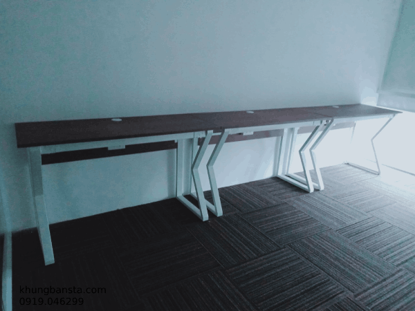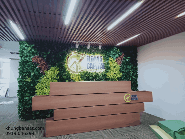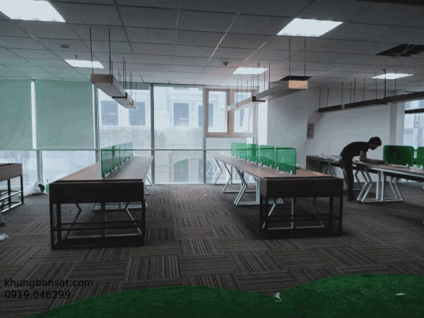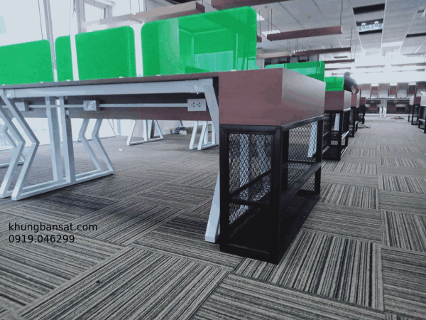 Công trình được công ty TNHH Phúc Vinh sản xuất thi công, chân bàn sắt mặt gỗ MFC ván Thanh Thùy, chân sắt hộp 25x50x1.2, các kệ sách sắt sơn tĩnh điện, kệ hoa bằng sắt chắc chắn, công trình được thiết kế kết hợp hoài hòa đưa không gian xanh vào khu làm việc, giúp văn phòng trở nên sống động, không nhàm chán, chân sắt sơn trắng, mặt bàn màu vân gỗ tạo nên sự sang trọng.